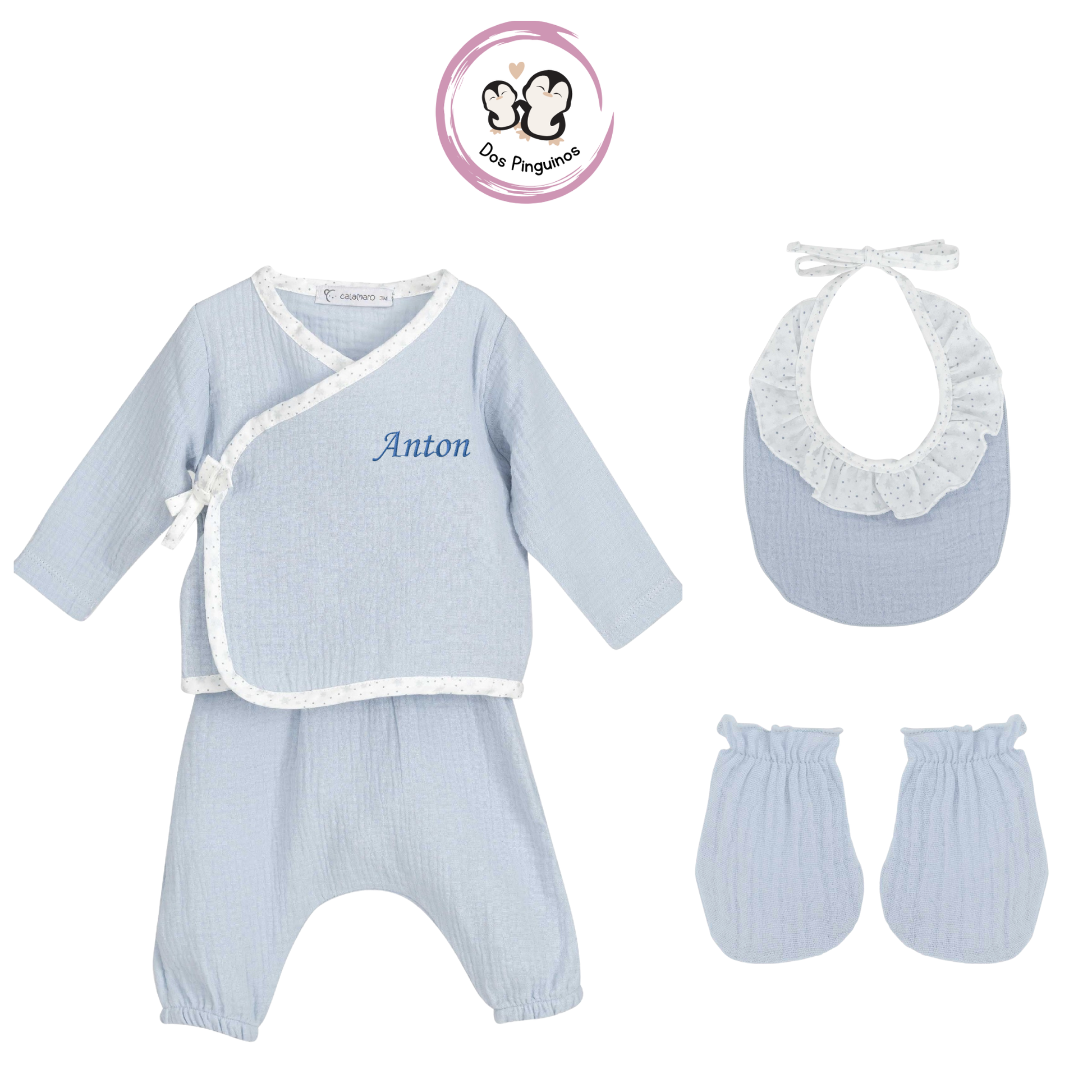 Este adorable pack en color azul está pensado para recibir al recién nacido con máxima suavidad y comodidad.