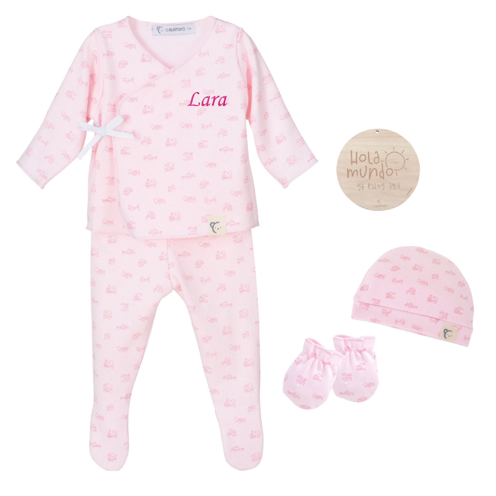 Incluye blusa cruzada con bordado personalizado, polaina a juego, gorrito, manoplas y tarjeta de madera con el mensaje “Hola mundo, ya estoy aquí”.